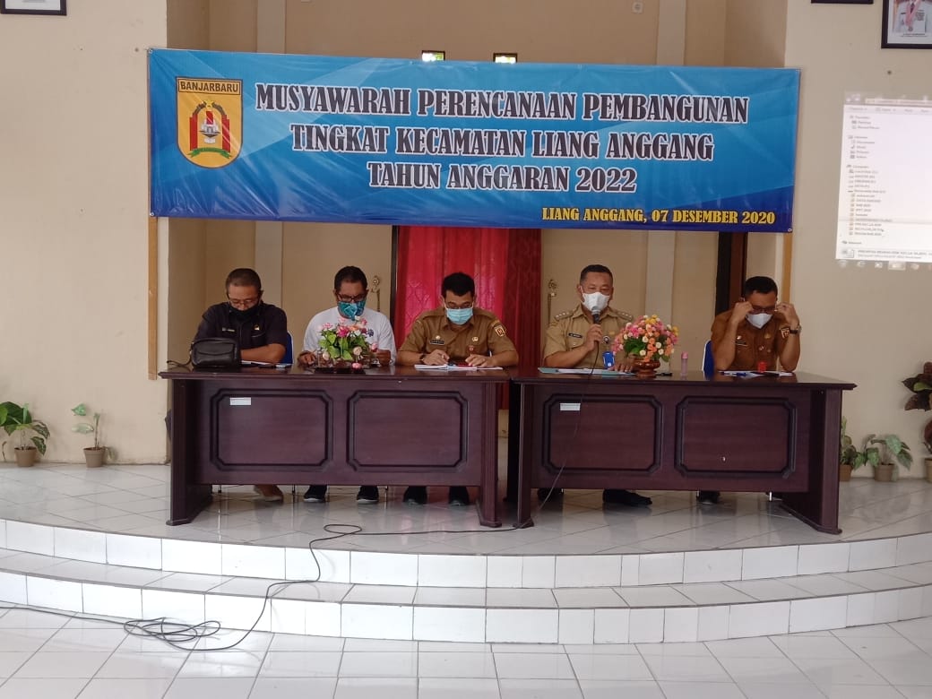 Kegiatan Musyawarah Perencanaan Pembangunan (Musrenbang) Tingkat Kecamatan Liang Anggang Tahun Anggaran 2022 yang dilaksanakan hari ini, Senin 7 Desember 2020 di Aula Kecamatan Liang Anggang berjalan dengan lancar dan tertib sesuai dengan Protokol Kesehatan , Acara dibuka Oleh Camat Liang Anggang Bapak Adrianoor Rivai. S. Sos, Hadir Juga Kepala Bappeda Kota Banjarbaru Bapak Kanafi. S. IP. MM, Kepala Dinas Lingkungan Hidup Bapak Sirajoni, Anggota DPRD Kota Banjarbaru Dapil Liang Anggang Bapak Sukardi, Bapak Taufikurrahman, Bapak Sartomo W.D serta dari DANRAMIL Bapak Nur Yanto