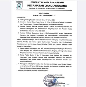 Kamis 8 Juli 2021 diadakan Kegiatan Workshop Bagi Penggiat P4GN Instansi Pemerintah Kota Banjarbaru dari BNN Kota Banjarbaru, dengan ini Kecamatan Liang Anggang mengirim dua orang yaitu Ahmad Humaidi dan Adam untuk menghadiri acara tersebut. Diharapkan setelah mengikuti acara tersebut kedepannya bisa disosialisasikan kembali kepada teman-teman staff Kecamatan dan Kelurahan yang berada di Wilayah Kecamatan Liang Anggang. (***/da)