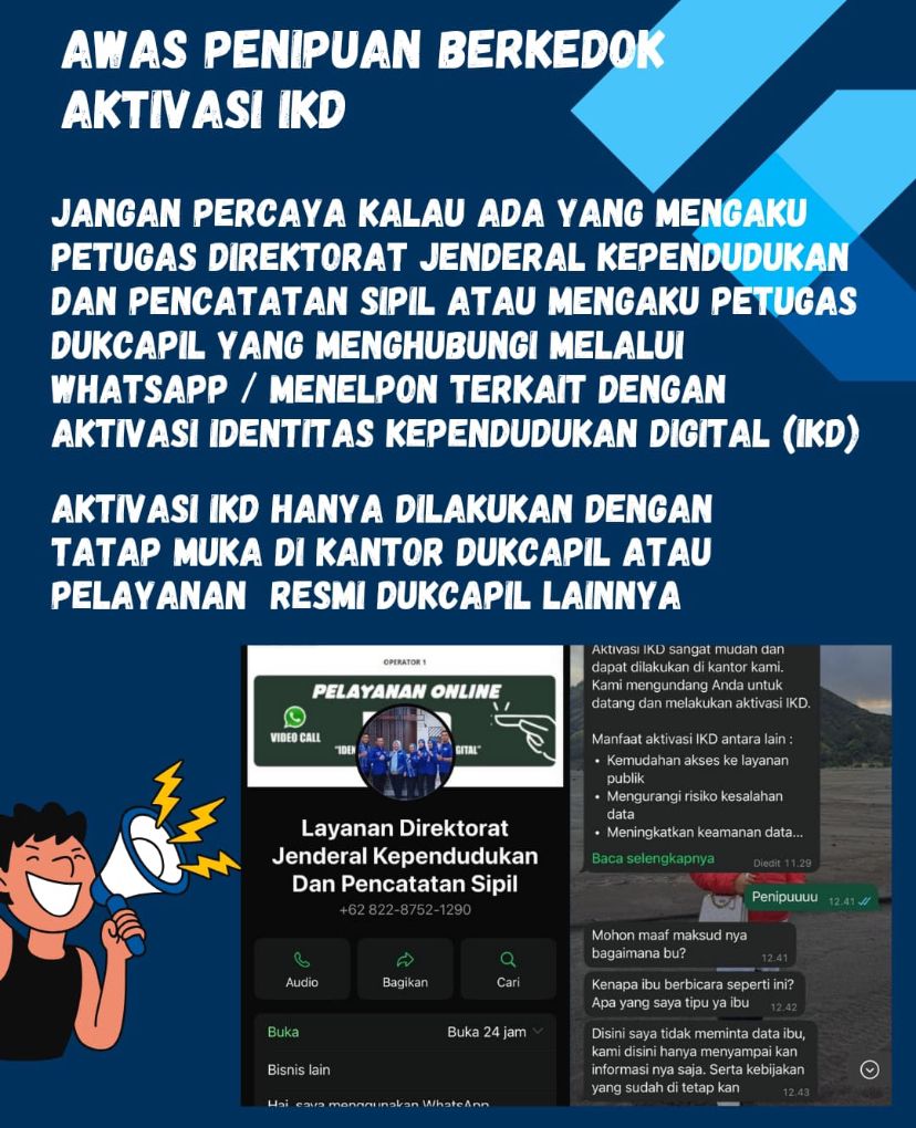 AWAS PENIPUAN!! Dengan modus aktivasi identitas kependudukan (IKD), Dirjen Dukcapil / Petugas dukcapil tidak pernah menghubungi masyarakat terkait dengan aktivasi IKD