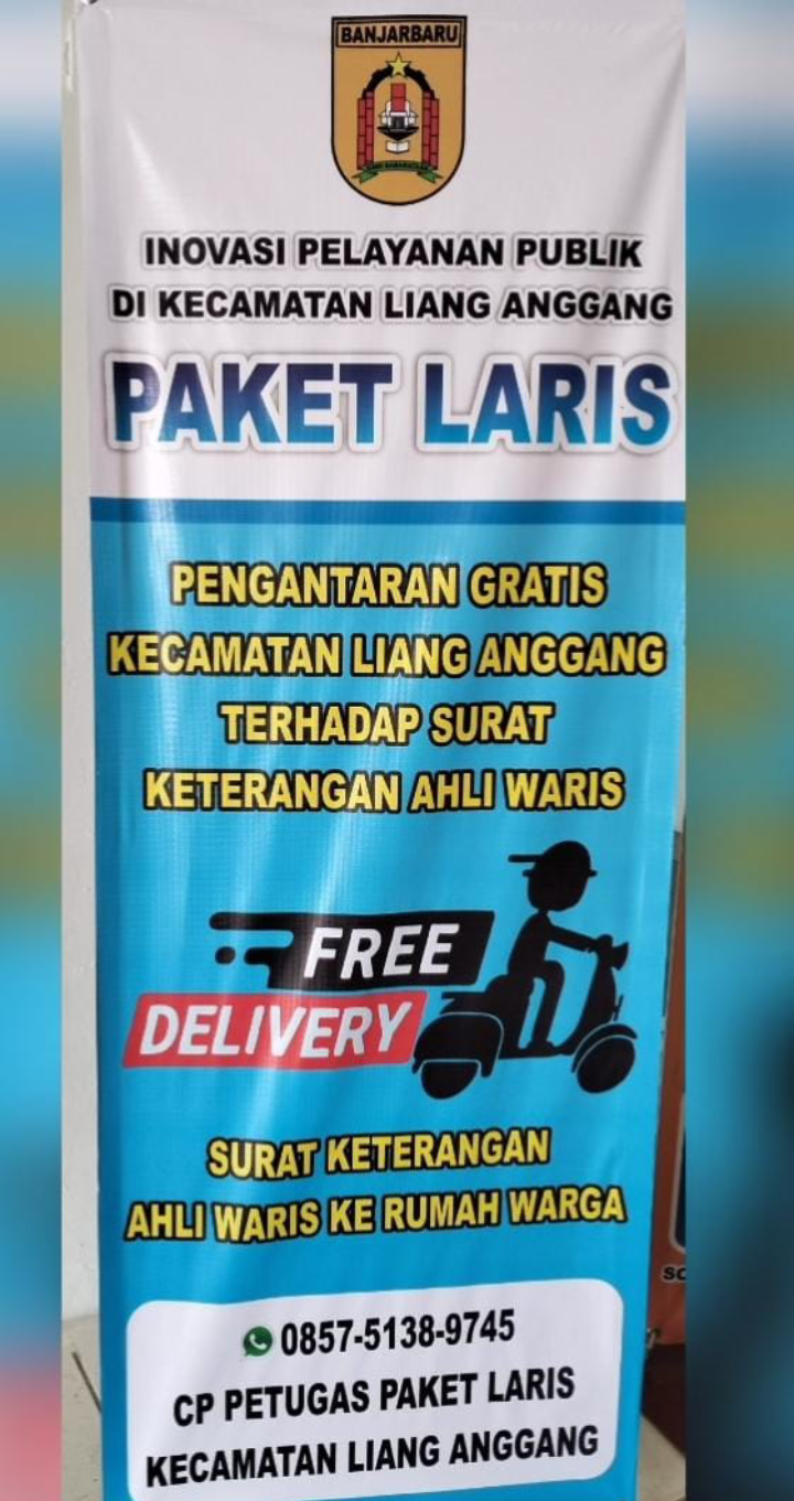 Satu Lagi Inovasi pelayanan Kecamatan Liang Anggang diluncurkan oleh Bapak Camat Liang Anggang Taufik Purwanto, S.STP, M.AP. yakni Paket Laris PAKET LARIS (Layanan Gratis Kecamatan Liang Anggang Surat Keterangan Ahli Waris) Untuk semua Warga di 4 (empat) Kelurahan wilayah kerja Kecamatan Liang Anggang Free Delivery : Pasti Sampai Kerumah Warga